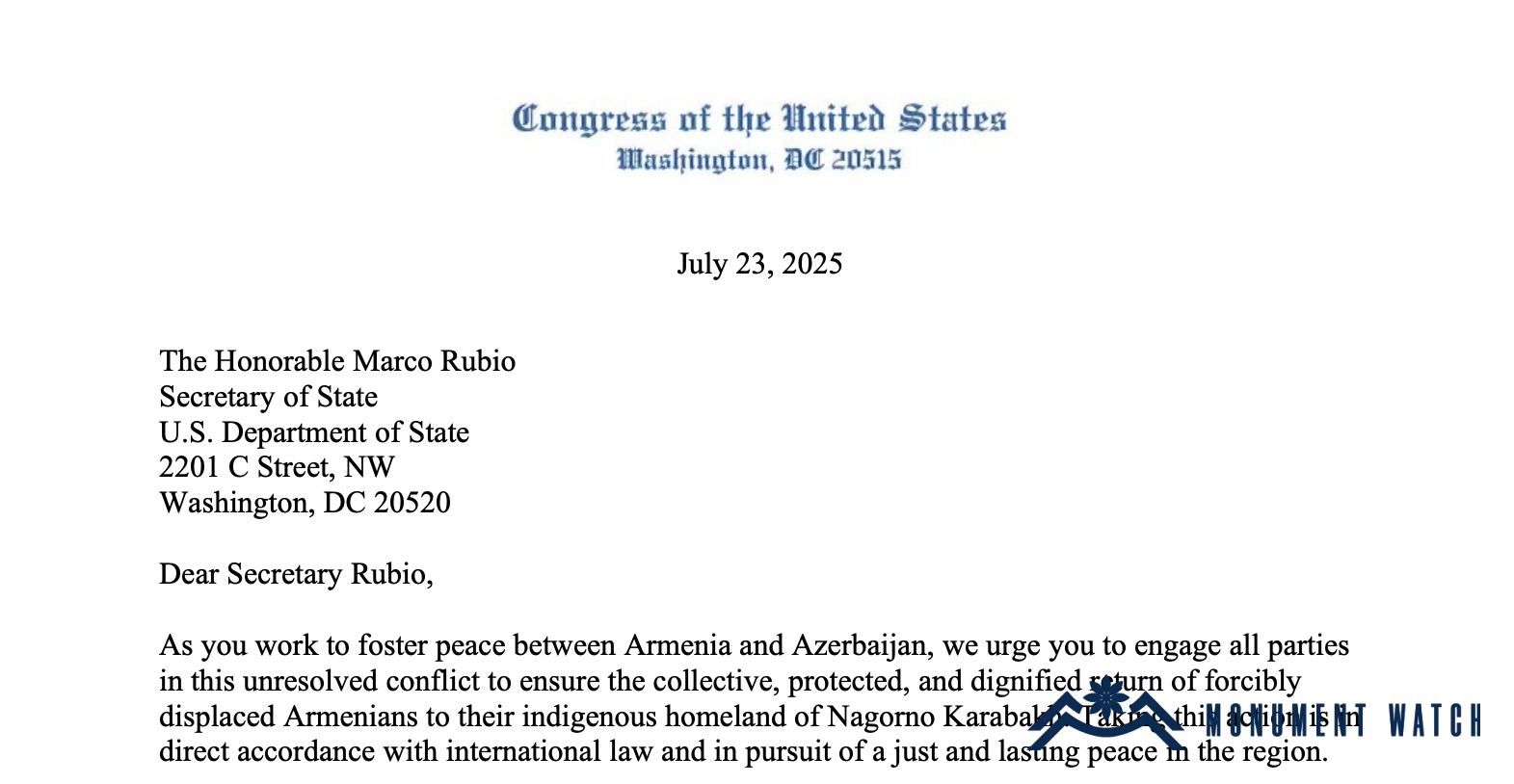 On July 23, 87 members of the U.S. Congress sent an official letter to U.S. Secretary of State Marco Rubio, addressing Azerbaijan's policy of destroying historic churches and monasteries in the region. (https://anca.org/assets/pdf/072325_ArmenianCaucus_RightofReturn.pdf)