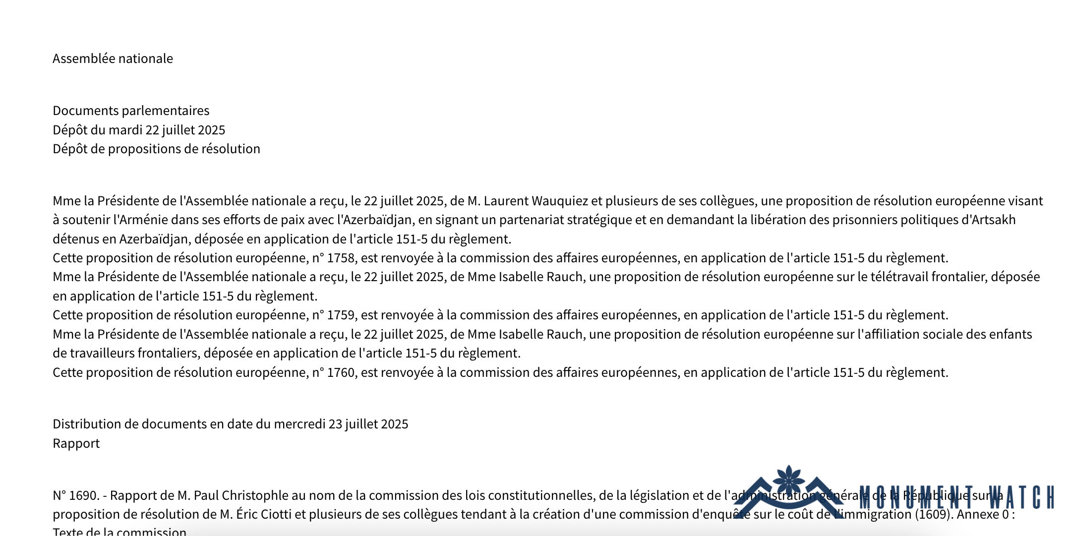 On July 22, 2025, the President of the French National Assembly received from MPs Laurent Wauquiez and Alexandra Martin a proposal for a European resolution to support Armenia's efforts to achieve peace with Azerbaijan by concluding a strategic partnership with France. Among other issues, the proposal also addresses Azerbaijan's policy of destroying historical monuments in Artsakh (Nagorno-Karabakh).