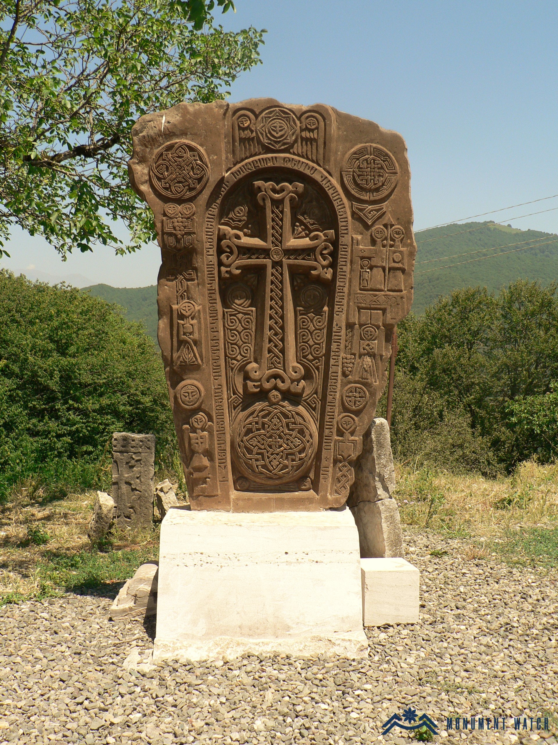 The khachkar created by painter-sculptor Robert Askaryan is situated beside the Church of Gandzasar and, as stated by the inscription encircling the sanctuary, is dedicated to the 20th anniversary of the re-establishment of the Diocese of Artsakh.
