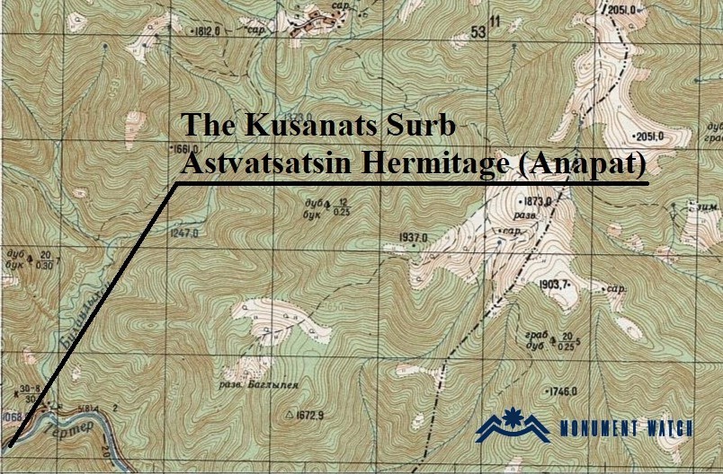 The hermitage of Kusanats SurbAstvatsatsin lies in the New Shahumian region of the Republic of Artsakh, on the right bank of the Trytu River, approximately 2.7 km northwest (as the crow flies) from Dadivank Monastery. It occupies the point where the Iridja River joins the Trytu through the narrow Iguadzor gorge (Karapetyan 1999, 76).