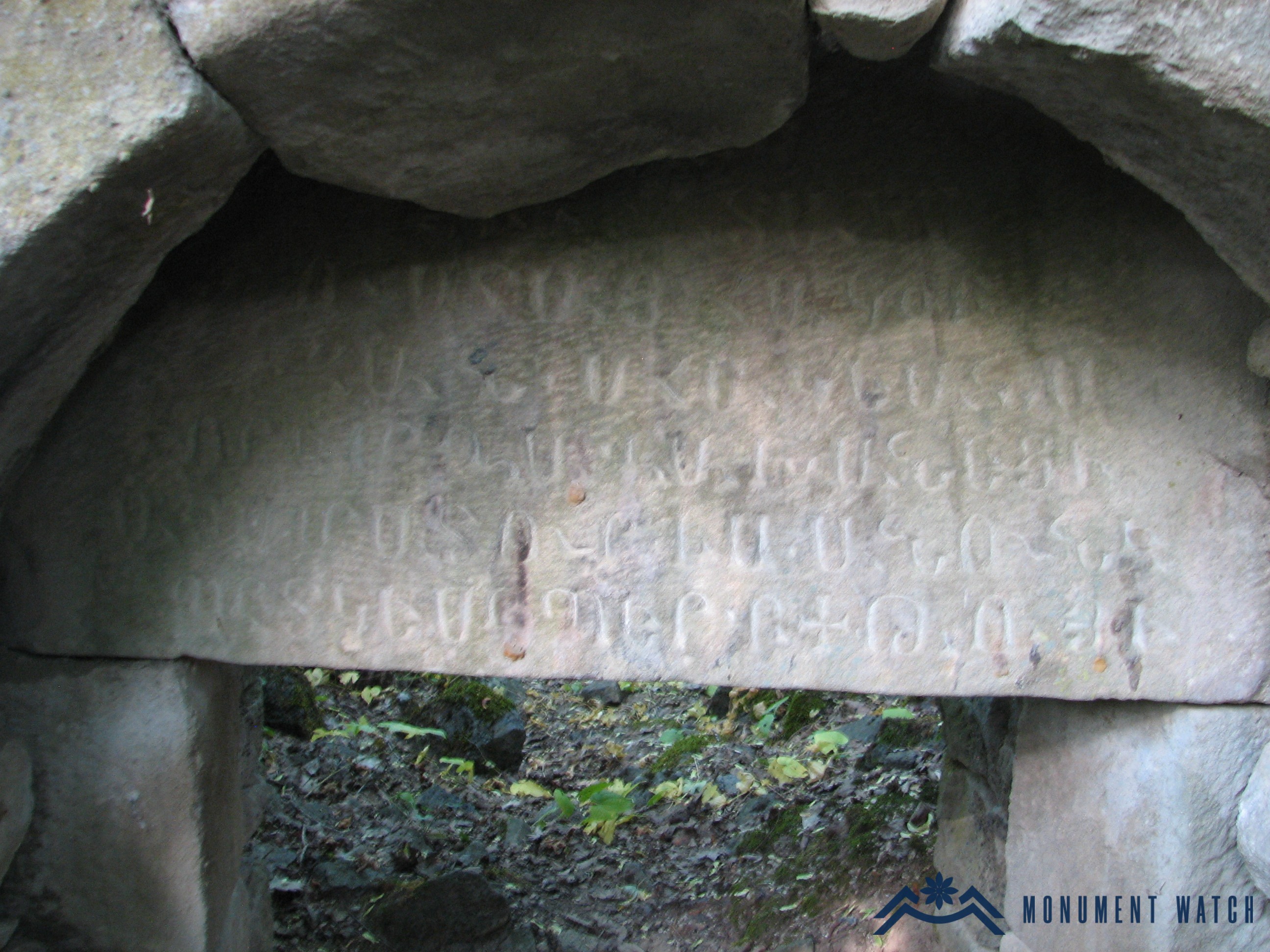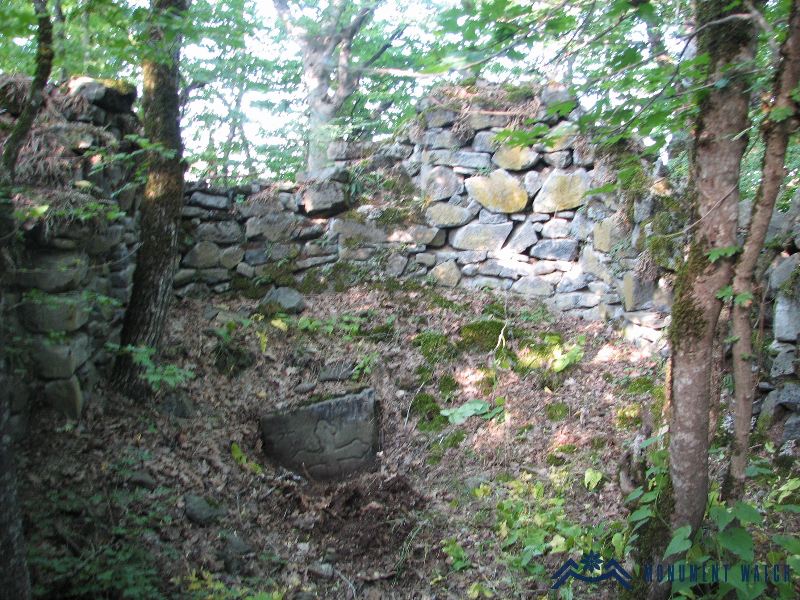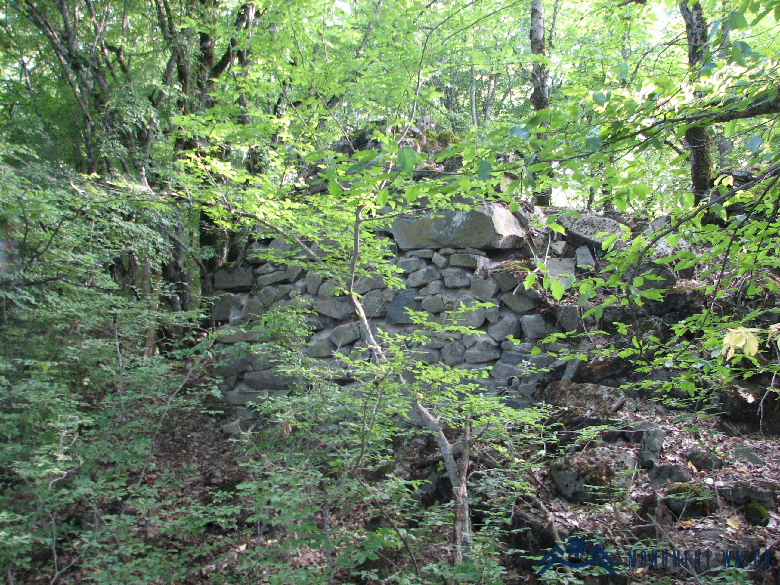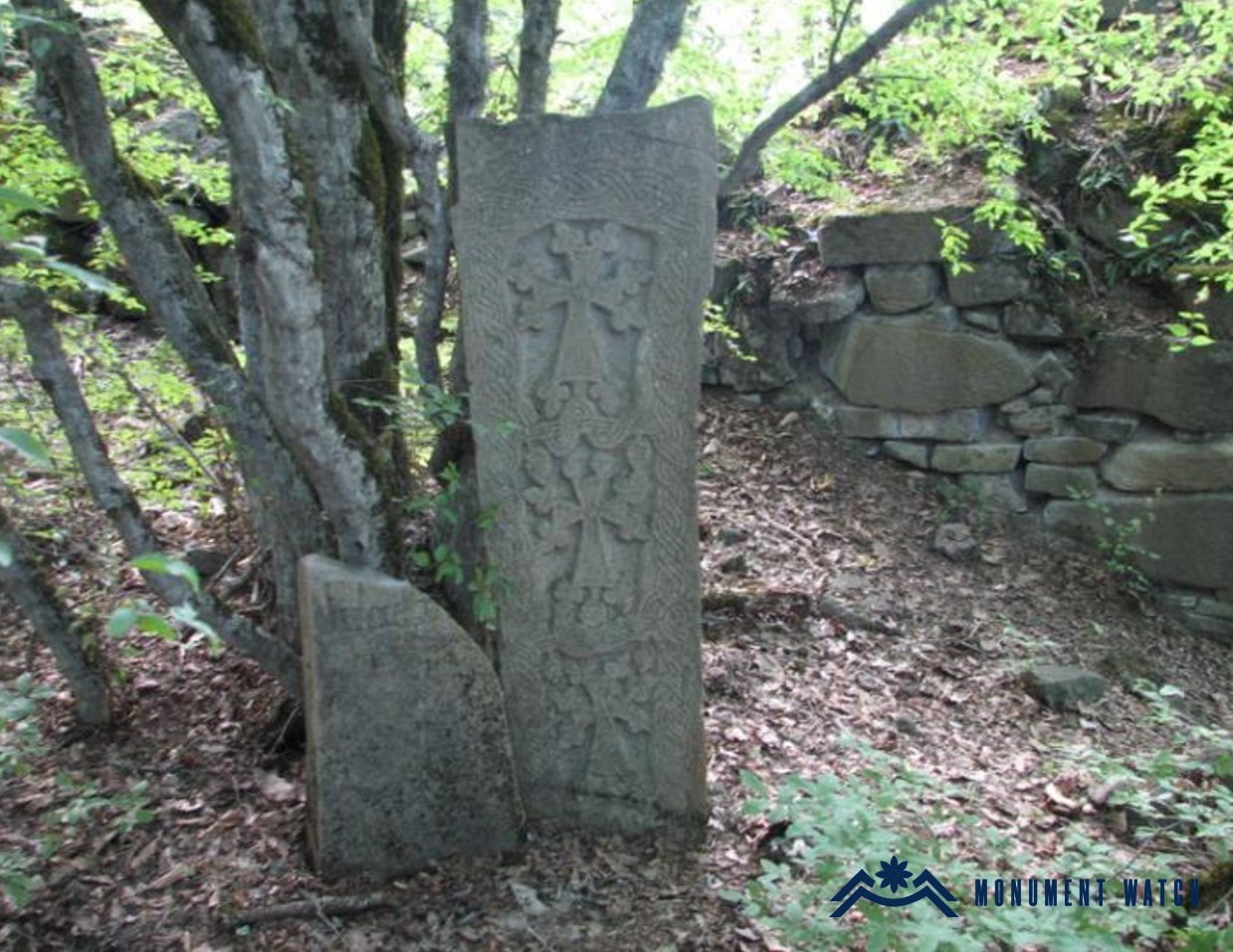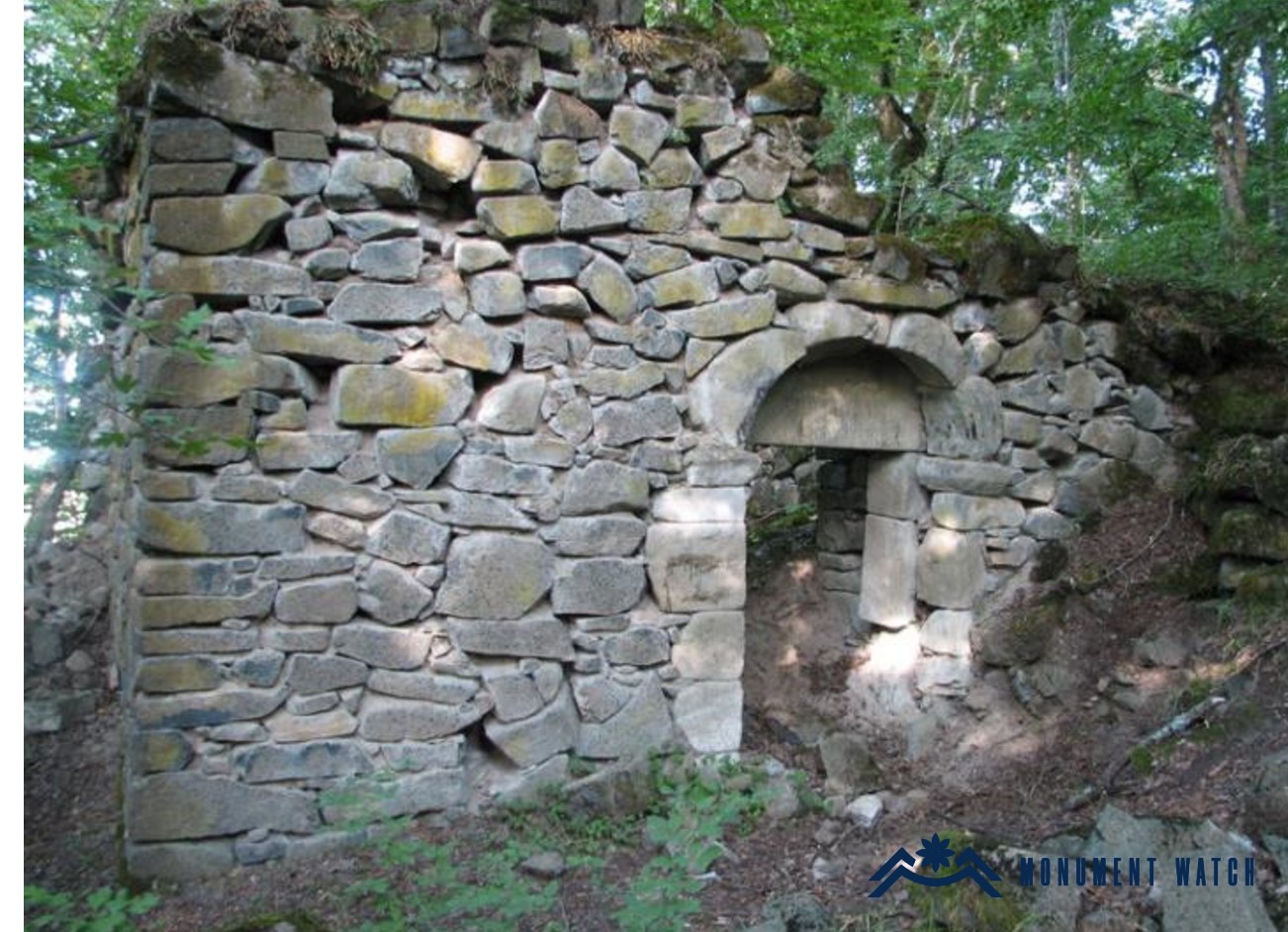 The monument stands on the summit of a high, conical, forested hill. At the center of the complex, in a semi-ruined state, is a single-nave church with a semicircular apse (length 6.3 m, width 3.1 m, height 2.5 m; Fig. 2). Opposite the church's only western entrance, the rectangular floor plan of the former gavit (narthex) can be traced. A perimeter wall once enclosed all of this, the remains of which are visible in fragments, most clearly on the western side (Fig. 3), where the outlines of two gates flanking the towers that formed the enclosure's entrance can be seen.