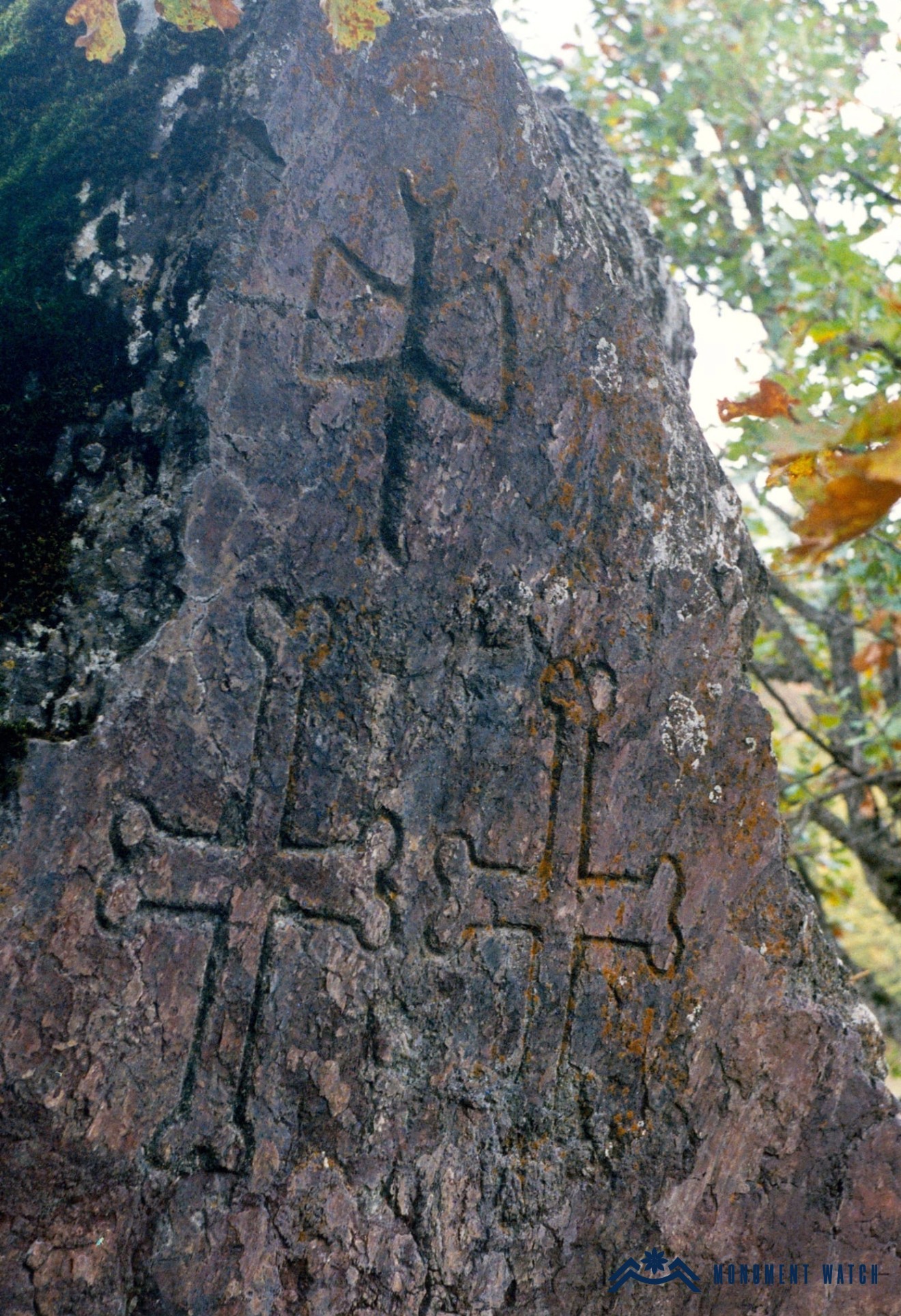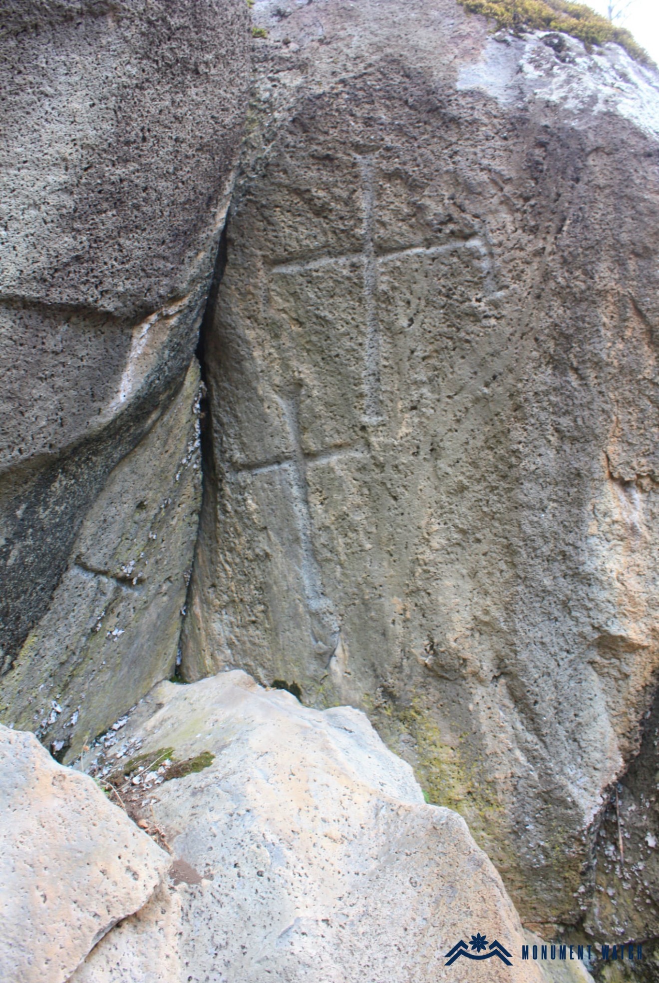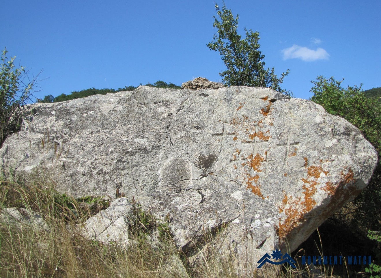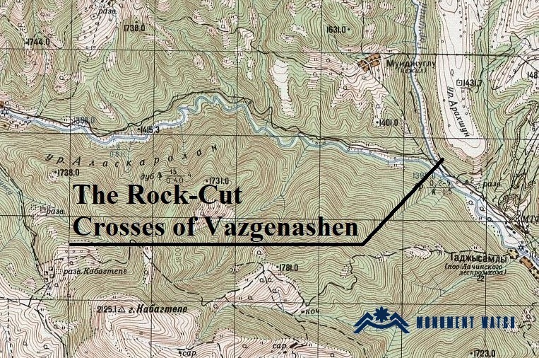 The first of the rock-cut crosses lies 1.4 km northwest of the village of Vazgenashen in the Kashatagh District, on the right side of the Vazgenashen–Shalva road, at the confluence of the eponymous streams. In the official Register of Monuments of the Kashatagh District of the Republic of Artsakh, the "Vazgenashen Rock-Cut Cross" is listed under no. 178 and dated to the 15th–16th centuries; its elevation is recorded as 1,270 m (Fig. 2). Several simple crosses are also carved on one of the fragments that has rolled down from the rocky promontory known as Rakhish.