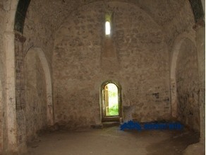 The church is a single-nave hall with a rectangular floor plan. It is built of small and medium-sized, roughly hewn and semi-hewn, whitish limestone with lime mortar. Only the door and window frames are made of dressed stone. The wall corners are laid with large, roughly hewn stones (Fig. 2). The building has a single entrance opening from the west. Inside, the church is covered with a vault; the vault rests on paired wall-arches attached to the northern and southern walls (Fig. 3). It has two sacristies, and lintels of the sacristy doors, reused fragments of tombstones, and khachkars with relief crosses and figurative carvings have been employed.