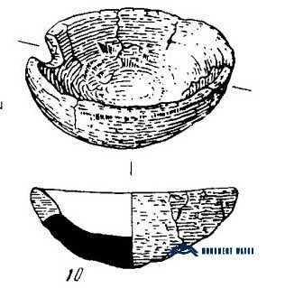 The earliest settlement (layer thickness: 0.8 m) formed on a low hill and was unfortified. It is characterised by an abundance of pits of various functions (70 pits were uncovered): ash pits near hearths, storage pits, a grain repository, and refuse pits (Fig. 4). Remains of a house built on posts were also identified in the same layer; its walls were made of reeds coated with clay. The roof consisted of wooden boards, and the clay floor was covered with matting. In the debris of the hearth, fragments of a portable clay oven were found; as ethnographic parallels suggest, bread was baked against its high vertical walls. A clay crucible was discovered in the hearth (Fig. 5), along with a piece of slag-evidence that bronze casting already played an essential role at the earliest stage of the settlement’s life. Near the hearth, river-stone pounders, polishers, and stone lids were found.