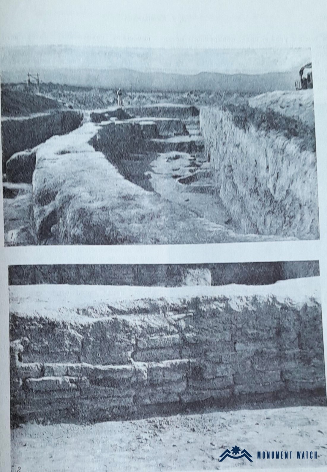 The middle layer-about 1.5 meters thick-was richer in materials. It contained a large number of stone hearths, hearth spots, and хозяйственные (economic/utility) pits. In this layer, a massive mudbrick defensive wall was uncovered. The curved outline of the cleared section (35 meters in length) indicates that the wall enclosed the central part of the hill and probably had several entrances (Fig. 8). The wall is 3 meters wide, with a preserved height of 1 meter. The principal finds and remains of dwellings were recorded on its inner side. During this period, the settlement suffered two fires, as evidenced by thick charcoal layers.