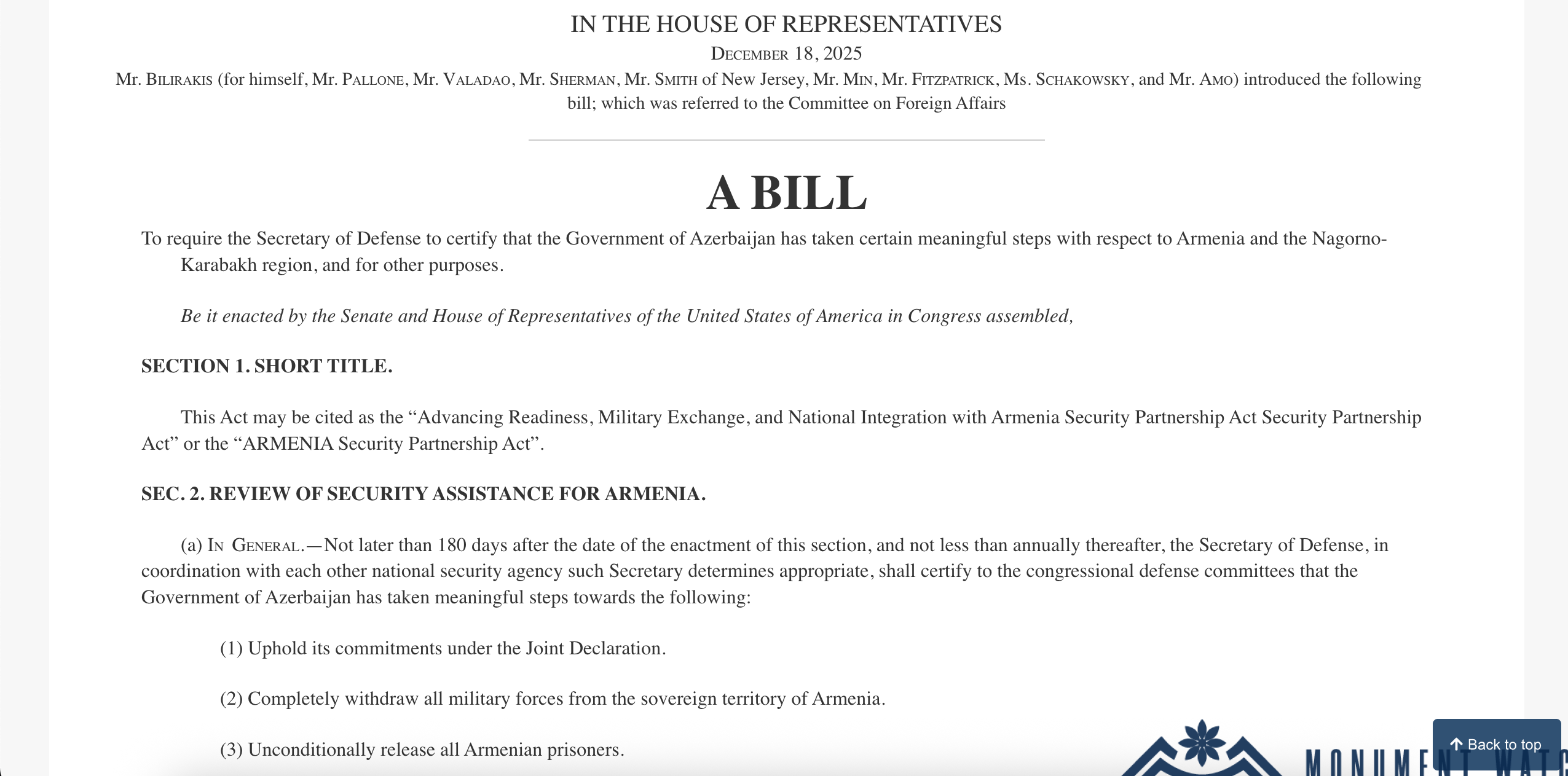 ԱՄՆ Կոնգրեսը պարտավորեցրել է Ադրբեջանին պահպանել Լեռնային Ղարաբաղի մշակութային ժառանգությունը և էթնիկ հայերի՝ Լեռնային Ղարաբաղում գտնվող իրենց տները վերադառնալու իրավունքը։ Դեռևս 2025 թվականի դեկտեմբերի 18-ին ԱՄՆ 119-րդ գումարման Կոնգրես (2025-2026 թթ.) ներկայացված H.R. 6840 օրինագիծը հստակ պահանջներ է սահմանում Ադրբեջանի նկատմամբ։ Փաստաթղթի 2-րդ՝ «Հայաստանի անվտանգային աջակցության վերանայում» բաժնում ամրագրված 5 առանցքային կետերով ԱՄՆ օրենսդիր մարմինը պայմանավորում է Ադրբեջանի հետ հարաբերությունները՝ պարտավորեցնելով վերջինիս ճանաչել էթնիկ հայերի՝ Լեռնային Ղարաբաղ վերադառնալու իրավունքը, ինչպես նաև երաշխավորել հայկական մշակութային և կրոնական ժառանգության պահպանությունը https://www.congress.gov/bill/119th-congress/house-bill/6840/text։ Կարևոր է արձանագրել, որ փաստաթուղթը պարտավորեցնում է Ադրբեջանին․