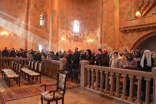 Արևմտյան կողմում՝ մուտքի վերևում կառուցված է երգչախմբի համար օթյակ։ Աղոթասրահը լուսառատ է, որն ապահովված է բազմաթիվ պատուհանների շնորհիվ։ Բնական լույսը ներթափանցում էր պատուհաններից և գմբեթից՝ խորհրդանշելով աստվածային ներկայությունը։ Ներսում Կային Հիսուս Քրիստոսի և Սուրբ Աստվածամոր պատկերներ։ Այստեղ ձևավորումը նպատակ ուներ ոչ թե շքեղությամբ տպավորել, այլ մարդուն կենտրոնացնել աղոթքի, լռության և հոգևոր կապի վրա։ Այն համադրում էր ավանդական հայկական եկեղեցու պարզությունն ու ժամանակակից կառուցվածքի տարածական զգացողությունը։