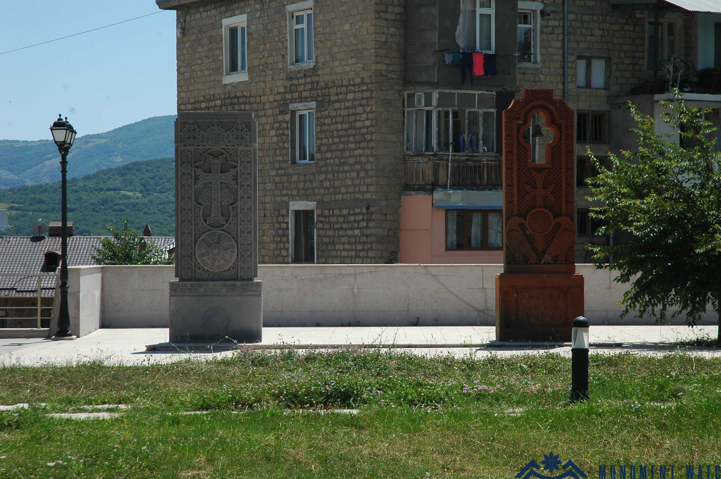 Եկեղեցու առջևում տեղադրված էին երկու խաչքարեր (նկ. 8) և մայրությունը խորհրդանշող կոթողը (նկ. 9)։